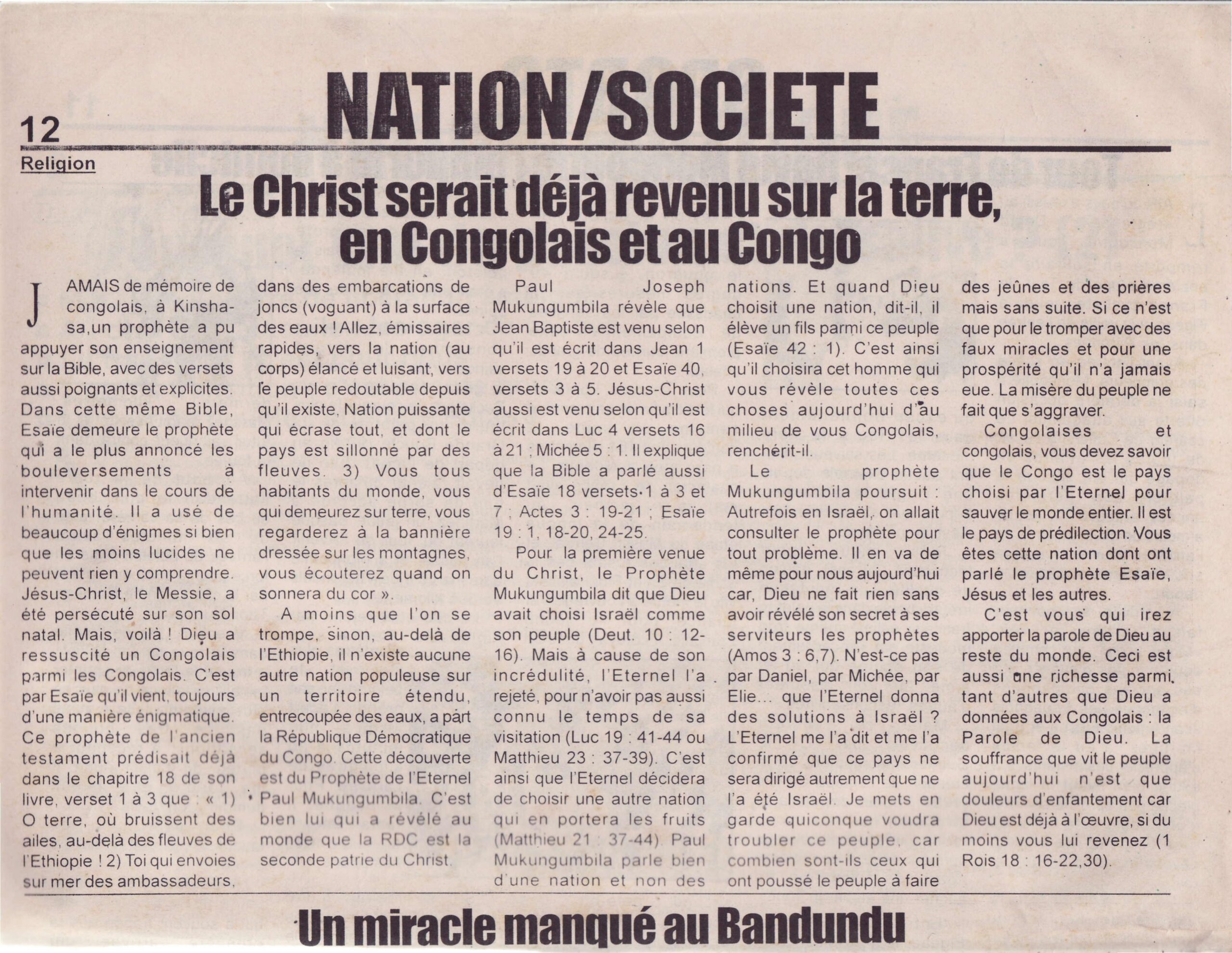 Jamais de mémoire de congolais, à Kinshasa, un prophète a pu appuyer son enseignement sur la Bible, avec des versets aussi poignants et explicites. Dieu a ressuscité un Congolais parmi les Congolais. C’est par Ésaïe qu’il vient, toujours d’une manière énigmatique.