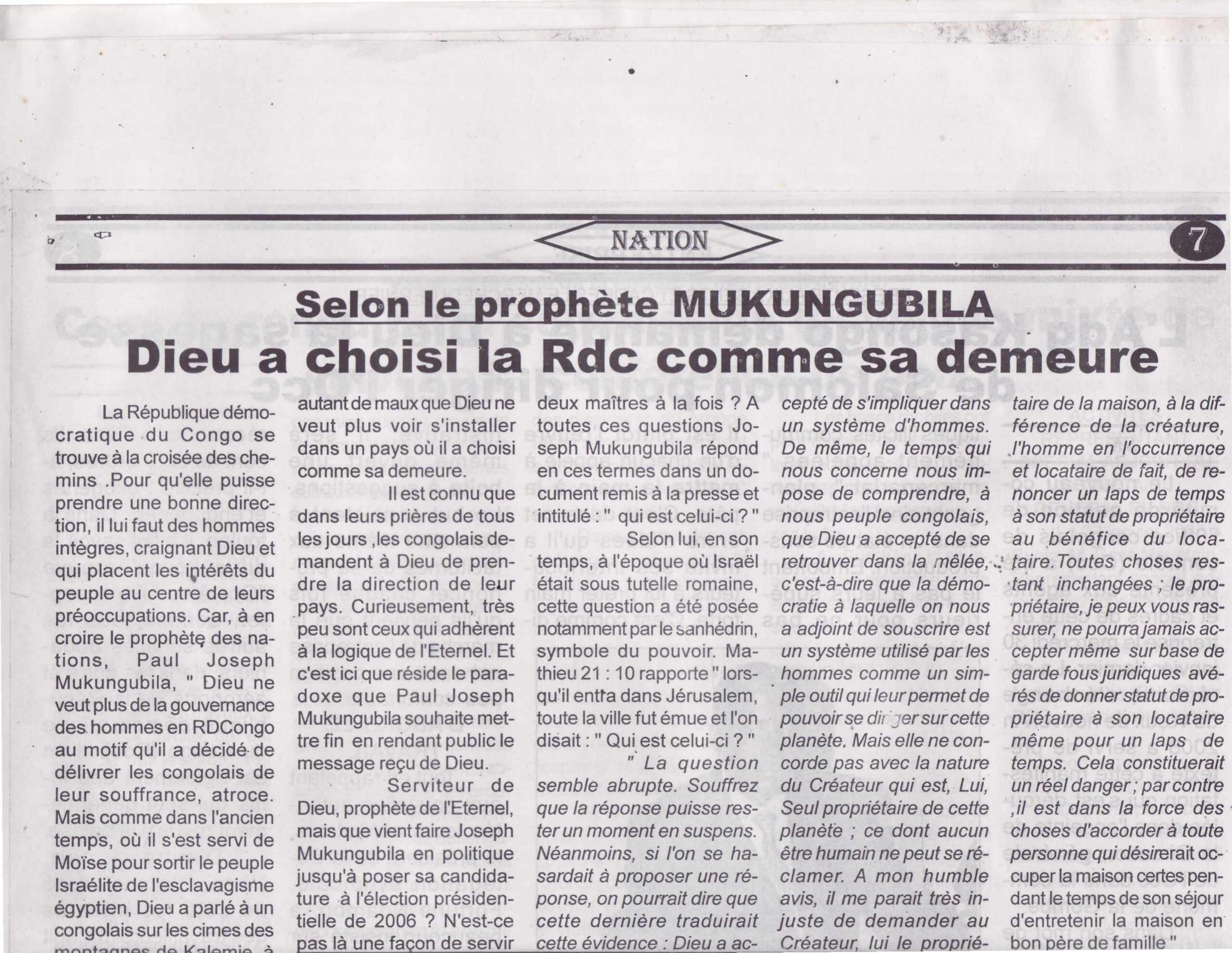 Car, à en croire le prophète des nations, Paul Joseph Mukungubila, « Dieu ne veut plus de la gouvernance des hommes en RDCongo au motif qu’il a décidé de délivrer les congolais de leur souffrance, atroce. Mais comme dans l’ancien temps, où il s’est servi de Moïse pour sortir le peuple Israélite de l’esclavagisme égyptien, Dieu a parlé à un congolais sur les cimes des montagnes de Kalemie, à la source du Nil. »