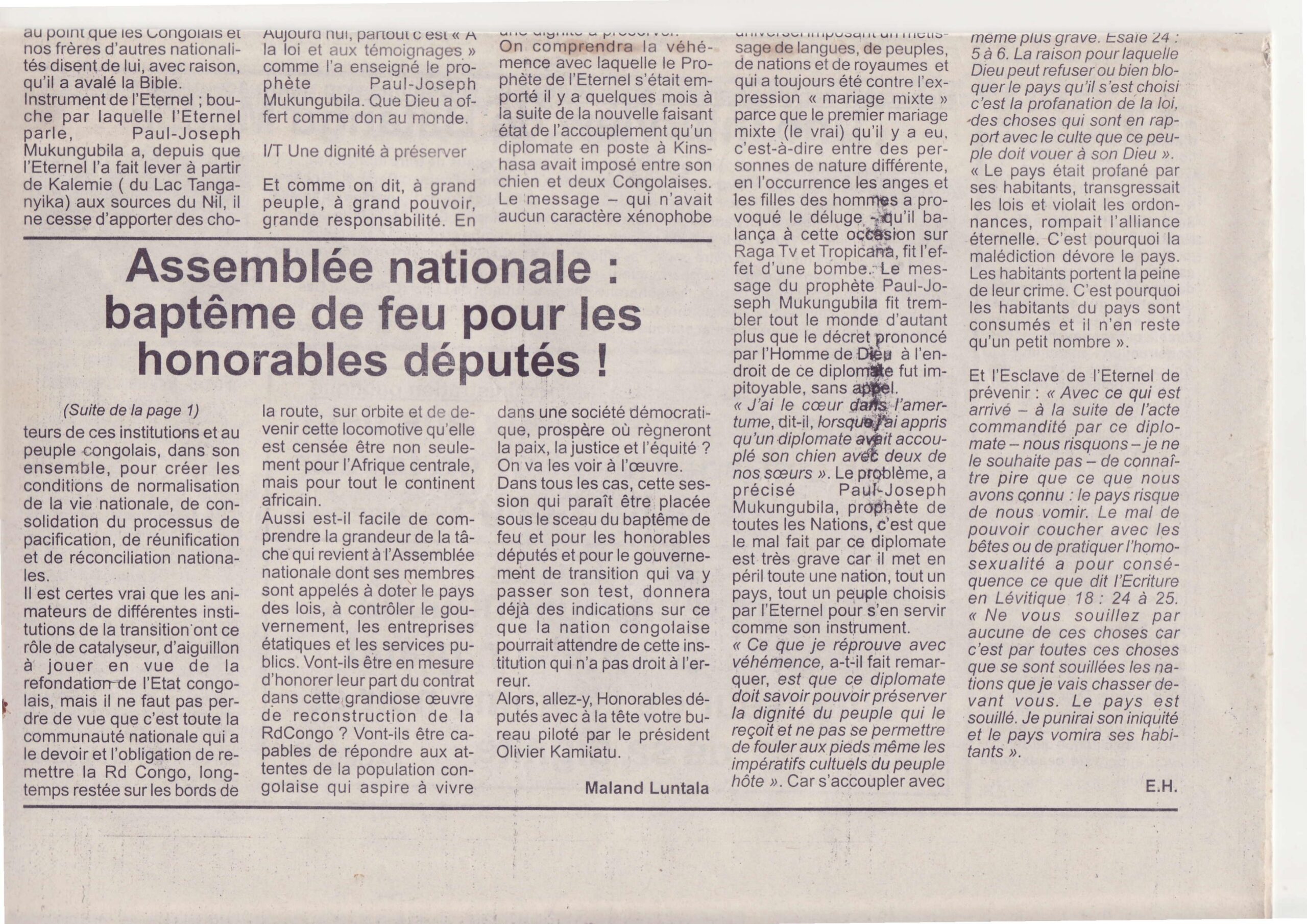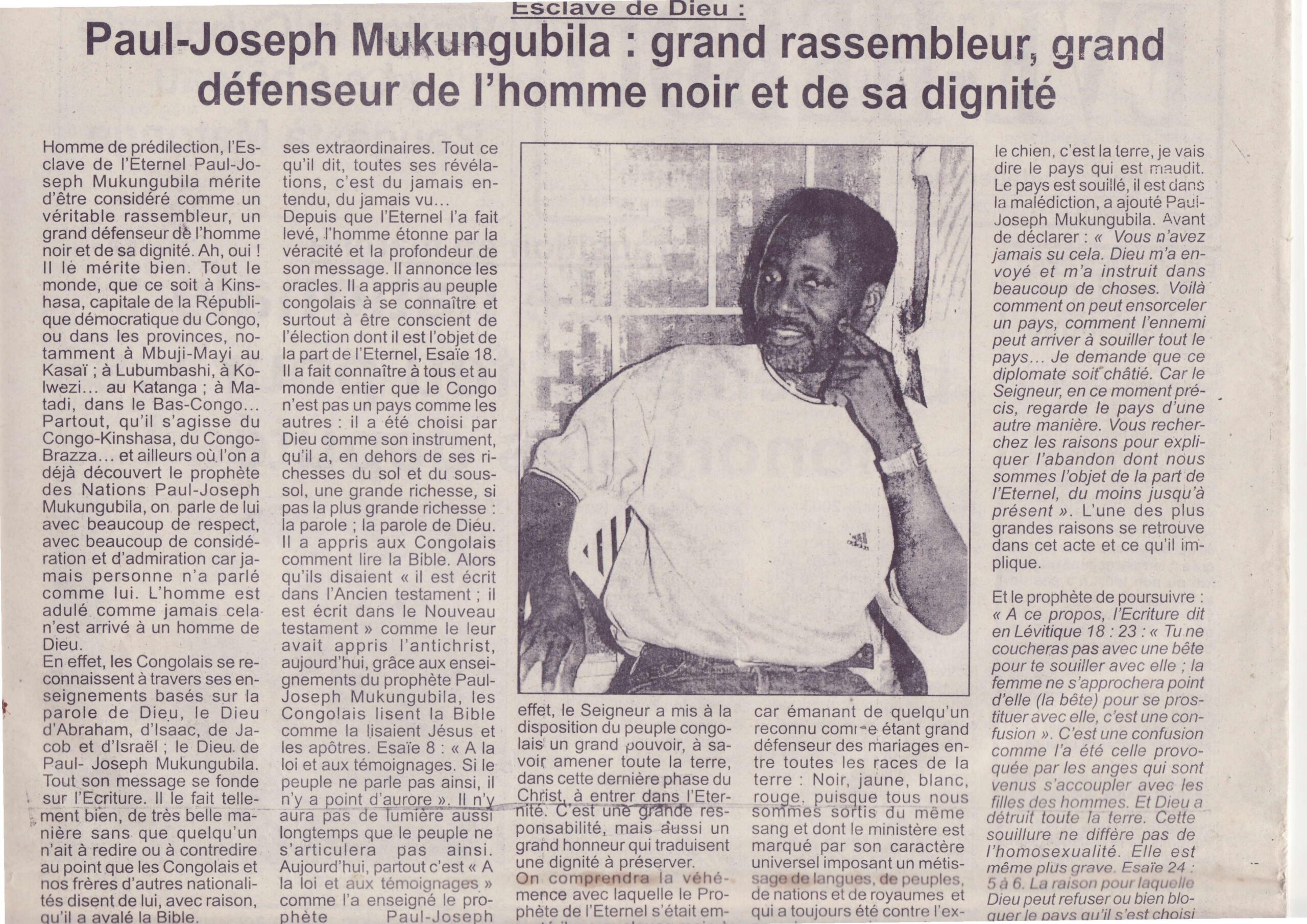 Homme de prédilection, l’Esclave de l’Éternel Paul-Joseph Mukungubila mérite d’être considéré comme un véritable rassembleur, un grand défenseur de l’homme noir et de sa dignité. Partout où l’on a déjà découvert le prophète des Nations, on parle de lui avec beaucoup de respect car jamais personne n’a parlé comme lui.