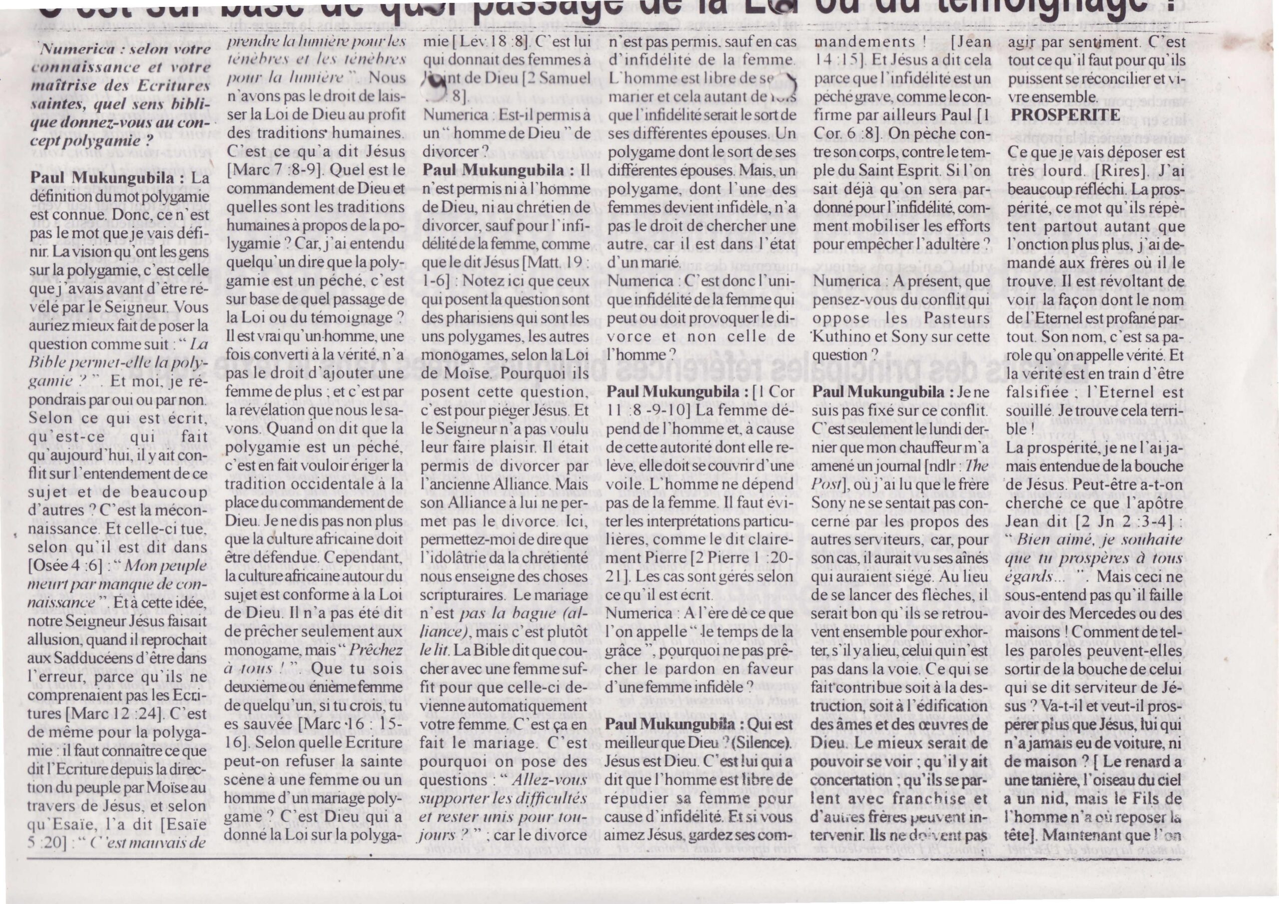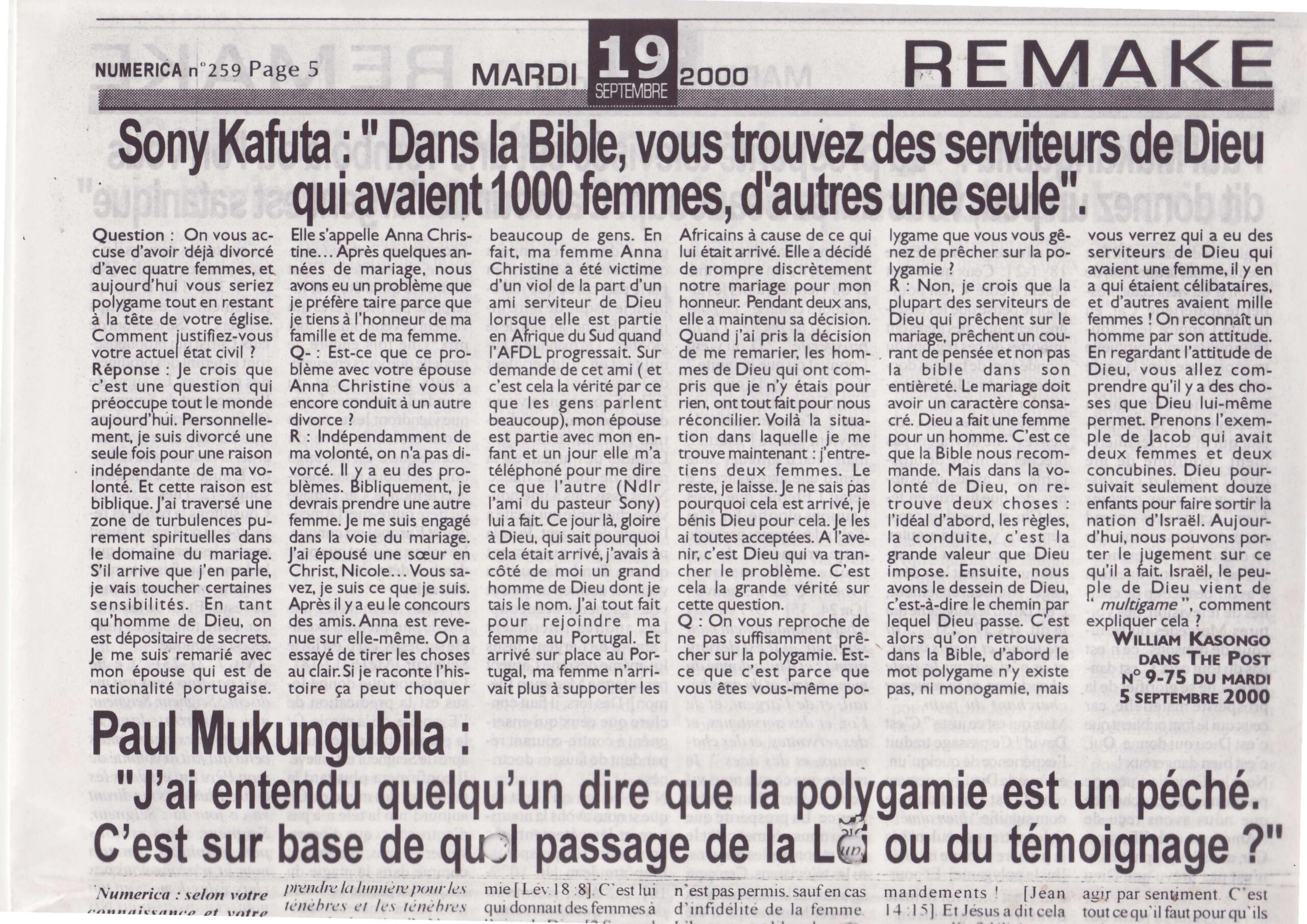 Republication (Remake) de l’interview de Paul Mukungubila sur la polygamie parue dans Numerica N°258, accompagnée d’une interview de Sony Kafuta. Voir les scans originaux ci-dessous.