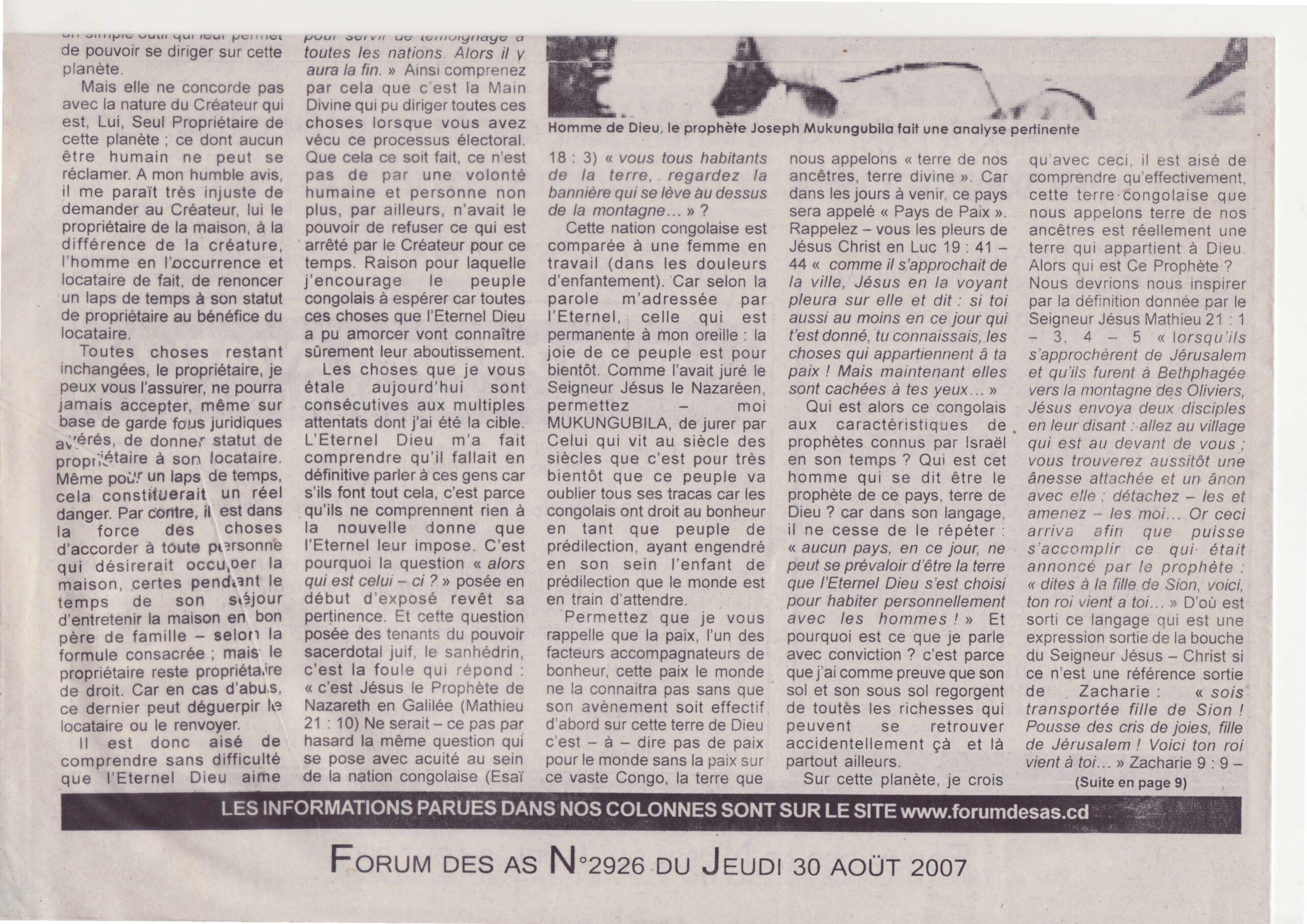 Cette nation congolaise est comparée à une femme en travail (dans les douleurs d’enfantement). Car selon la parole m’adressée par l’Éternel, celle qui est permanente à mon oreille : la joie de ce peuple est pour bientôt. Comme l’avait juré le Seigneur Jésus le Nazaréen, permettez-moi MUKUNGUBILA, de jurer par Celui qui vit au siècle des siècles que c’est pour très bientôt que ce peuple va oublier tous ses tracas car les congolais ont droit au bonheur en tant que peuple de prédilection, ayant engendré en son sein l’enfant de prédilection que le monde est en train d’attendre.