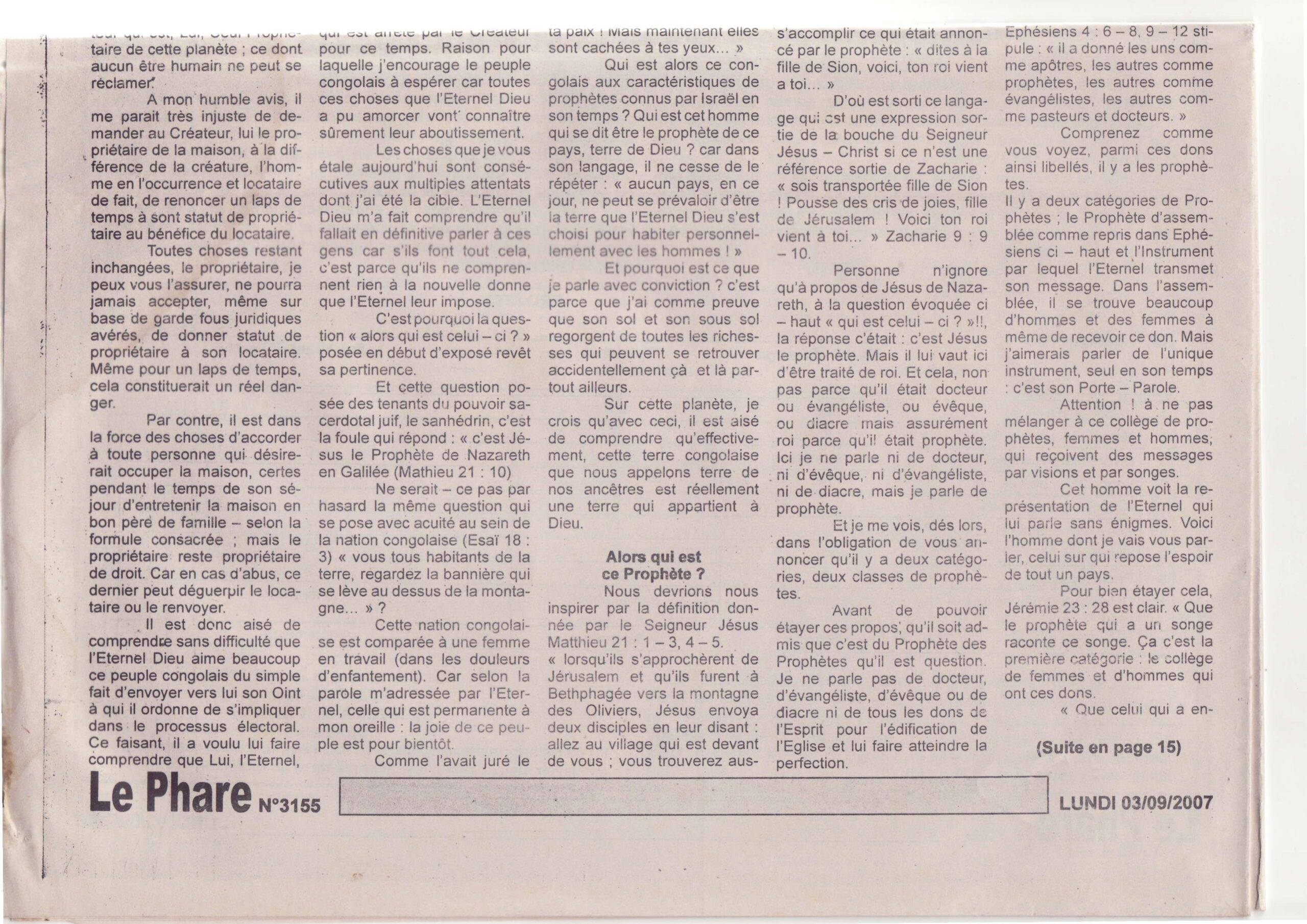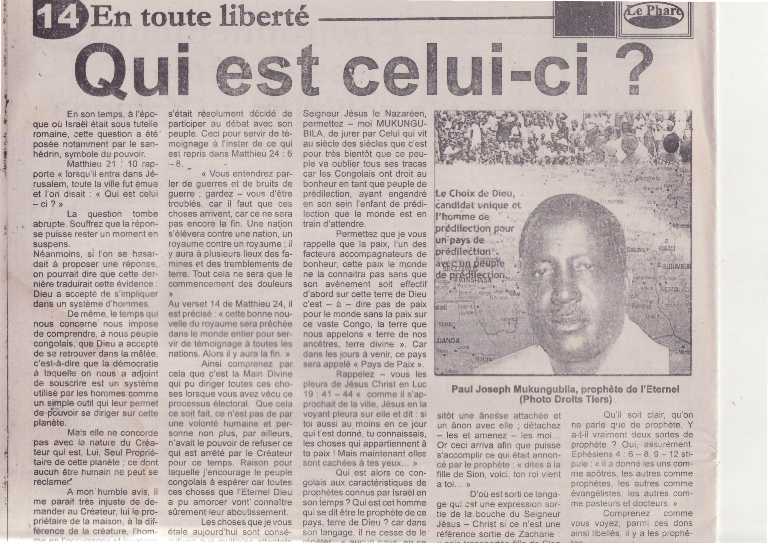 Articles Qui est celui-ci ? — Le Phare 📅 3 septembre 2007 Même article « Qui est celui-ci ? » republié dans Le Phare N°3155 du 3 septembre 2007, rubrique « En toute liberté ». Voir les scans originaux ci-dessous. Scans originaux du journal Partager : Facebook Twitter WhatsApp ← PrécédentQUI EST CELUI-CI ? Suivant →Mukungubila : L’homme par qui Dieu veut accomplir sa promesse sur la RDC — Afro Lipopo