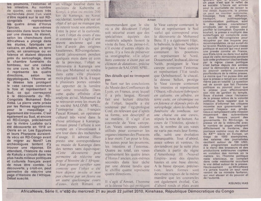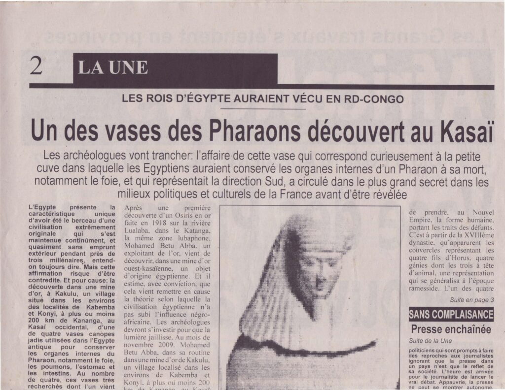 La découverte dans une mine d’or, à Kakulu, un village situé dans les environs des localités de Kabemba et Konyi, à plus ou moins 200 km de Kananga, au Kasaï occidental, d’un des quatre vases canopes jadis utilisés dans l’Égypte antique pour conserver les organes internes du Pharaon.