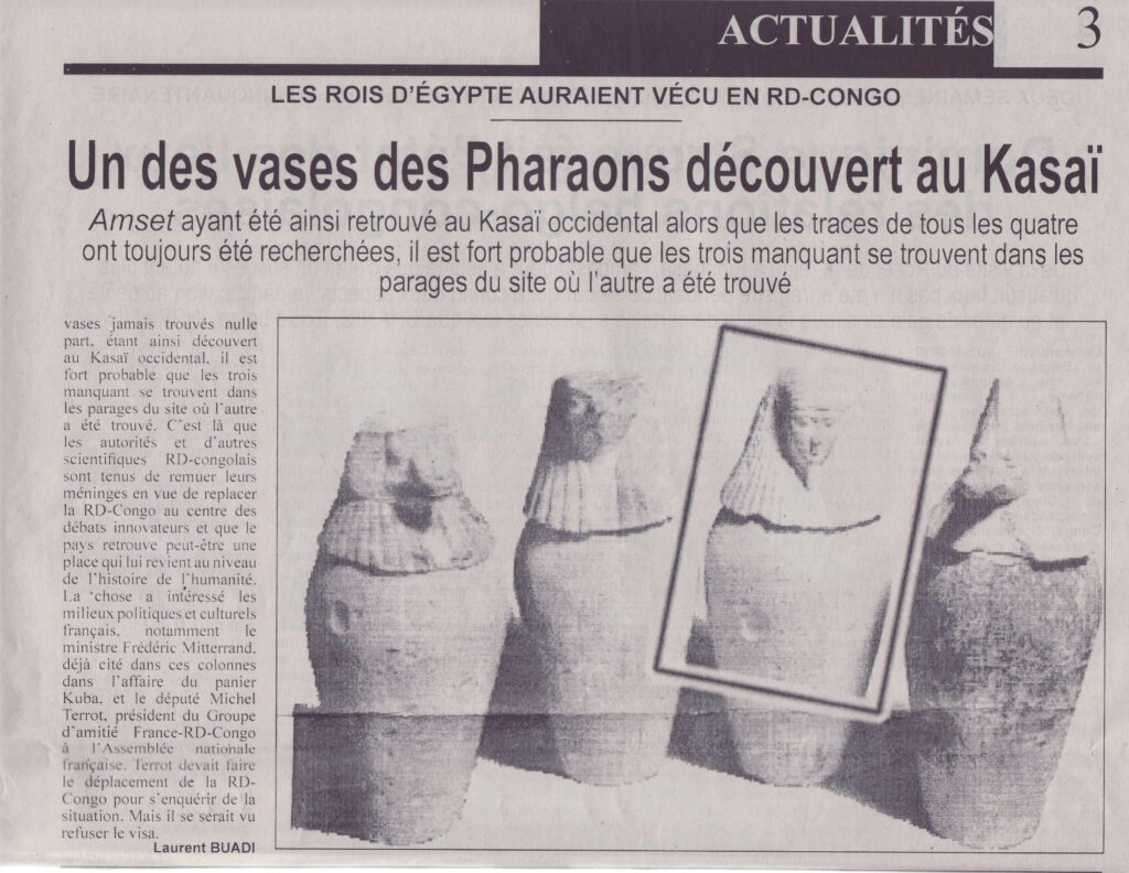 Les Égyptiens et leurs Pharaons auraient-ils vécu en RD-Congo avant de migrer au Nord ? Les archéologues tentent d’y trouver une réponse. L’affaire a circulé dans les plus hauts milieux politiques et culturels français, notamment le ministre Frédéric Mitterrand et le député Michel Terrot.
